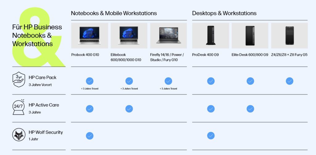 Beim Kauf eines HP Produkts erhalten unsere Kunden nicht nur erstklassige Hardware, sondern auch unschätzbare Mehrwerte. Dank des HP Hardware Services & Security Bundles sind Sicherheits- und Servicelösungen auf HP Business Notebooks und mobilen Workstations von Anfang an integriert.